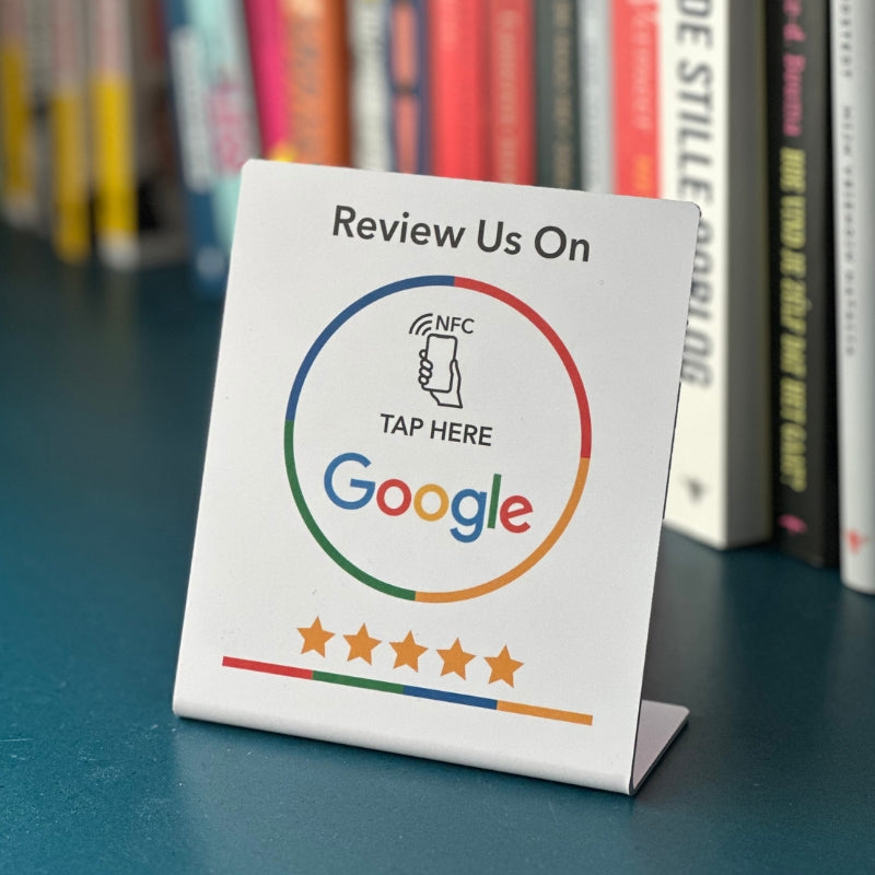 Maak het klanten makkelijk om een review achter te laten! Met deze strakke Google Review Stand tikken klanten eenvoudig met hun smartphone (NFC) en worden ze direct naar jouw Google reviewpagina geleid.